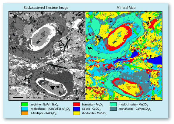 The upper feature has a core of mostly rhodonite, which is surrounded by hematite. That in turn is surrounded in succession by the Ba-feldspar, hyalophane, and then by the Mn-carbonate, rhodochrosite. The coatings of hyalophane have an enigmatic paragenesis, but must represent periods of barium, aluminum, and silica depositions on pre-existing grains. The fact that the hyalophane coating surrounds a hematite coating and is in turn surrounded by rhodochrosite, indicates that these phases or their precursors