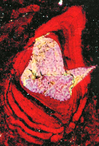 Photomicrograph of a micronodule from the Trommald Formation, Cuyuna iron range, east-central Minnesota. The core is a grain of aegirine surrounded by a coating of very fine grained aegirine and hematite.