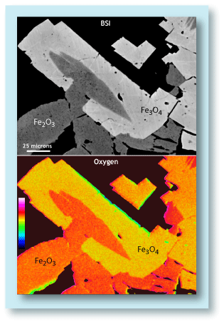 Backscattered electron image (BSI) and oxygen element map of magnetite (