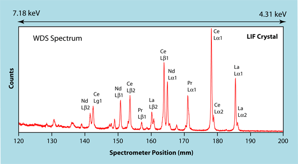 In contrast, in the EDS spectrum shown at the left, the X-ray lines for the rare earth elements (Ce & La) completely overlap on each other. This makes it impossible to determine if there are any other rare earth elements present. In the WDS spectrum one can clearly see that in addition to Ce and La, Pr and Nd are also present in the sample.
